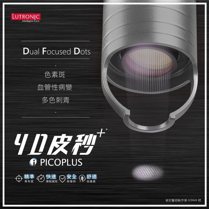 - PicoPlus 4D皮秒雷射來自於世界前三大雷射廠、韓國第一雷射大廠Lutronic,擁有美國、韓國、台灣三國的認證,是目前市面上擁有最多波長治療選擇的機種(532nm、595nm、660nm、1064nm),因此可以針對四種深度、四類色素提供精準的治療。