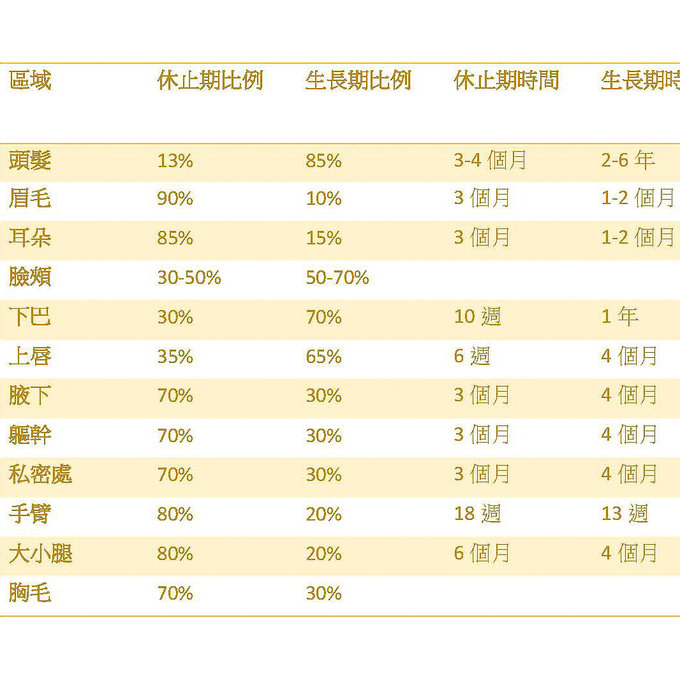 毛髮生長週期有分為生長期﹝Anagen Phase﹞、衰退期﹝Catagen Phase﹞以及休止期(Telegen Phase),唯有生長期的毛髮可以吸收足以破壞毛囊幹細胞的熱能,所以每次的雷射施打,即使有施打過雷射的區域,在數週之後,可能還是會有一些施打時處於衰退或是休止期的毛髮長出來,這就是為什麼所有的雷射除毛都需要多次的原因,附圖是毛髮生長的相關數據,可以提供給大家參考,數學好的人可以用這些數字大概估算出某部位毛髮所需要的次數。